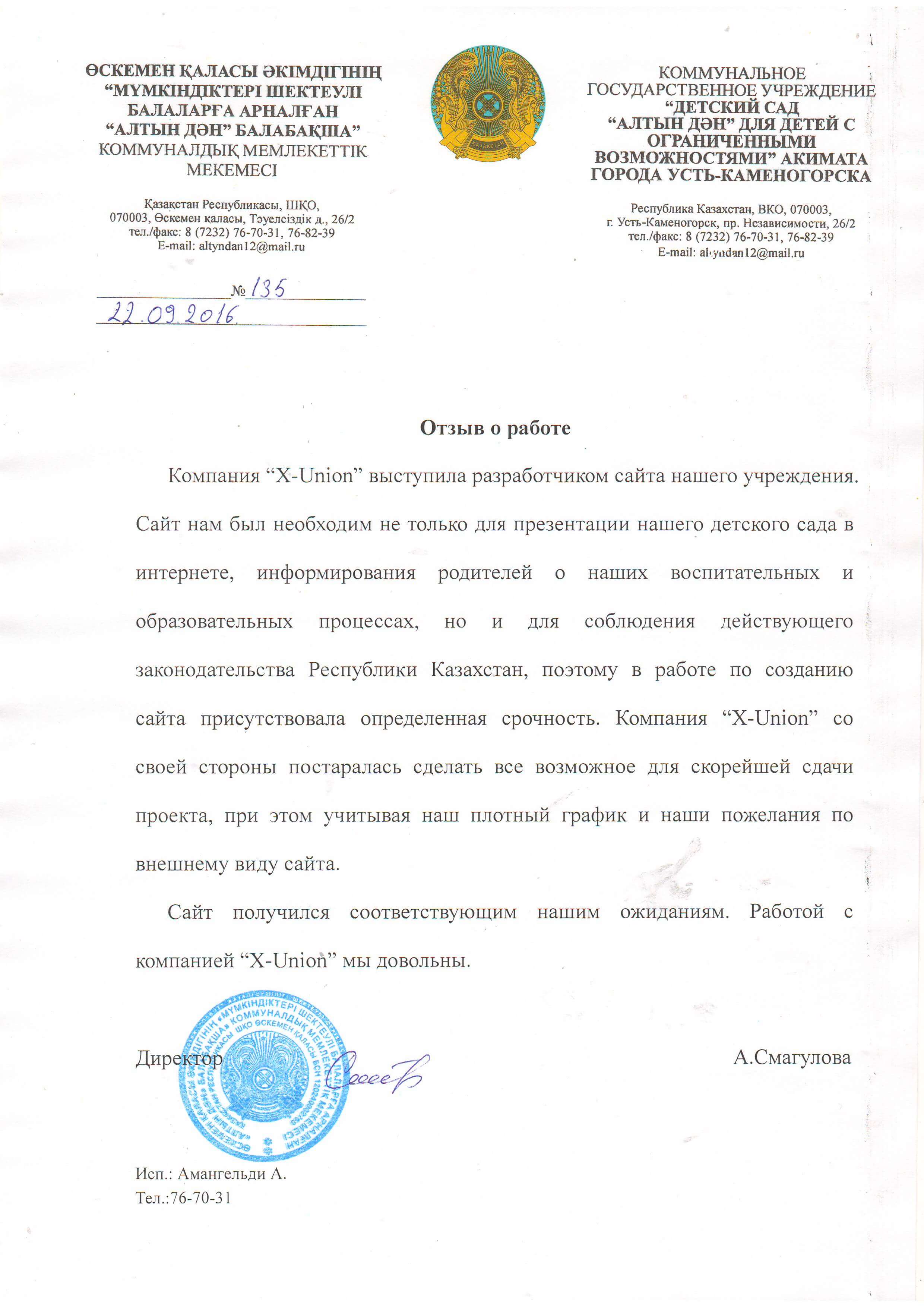 Учреждение КГУ "Детский сад №62 для детей с нарушениями речи" акимата города Усть-Каменогорска, в лице директора Ибраевой Гульден Ахметкалиевны выражает большую благодарность работе компании "X-UNION"!