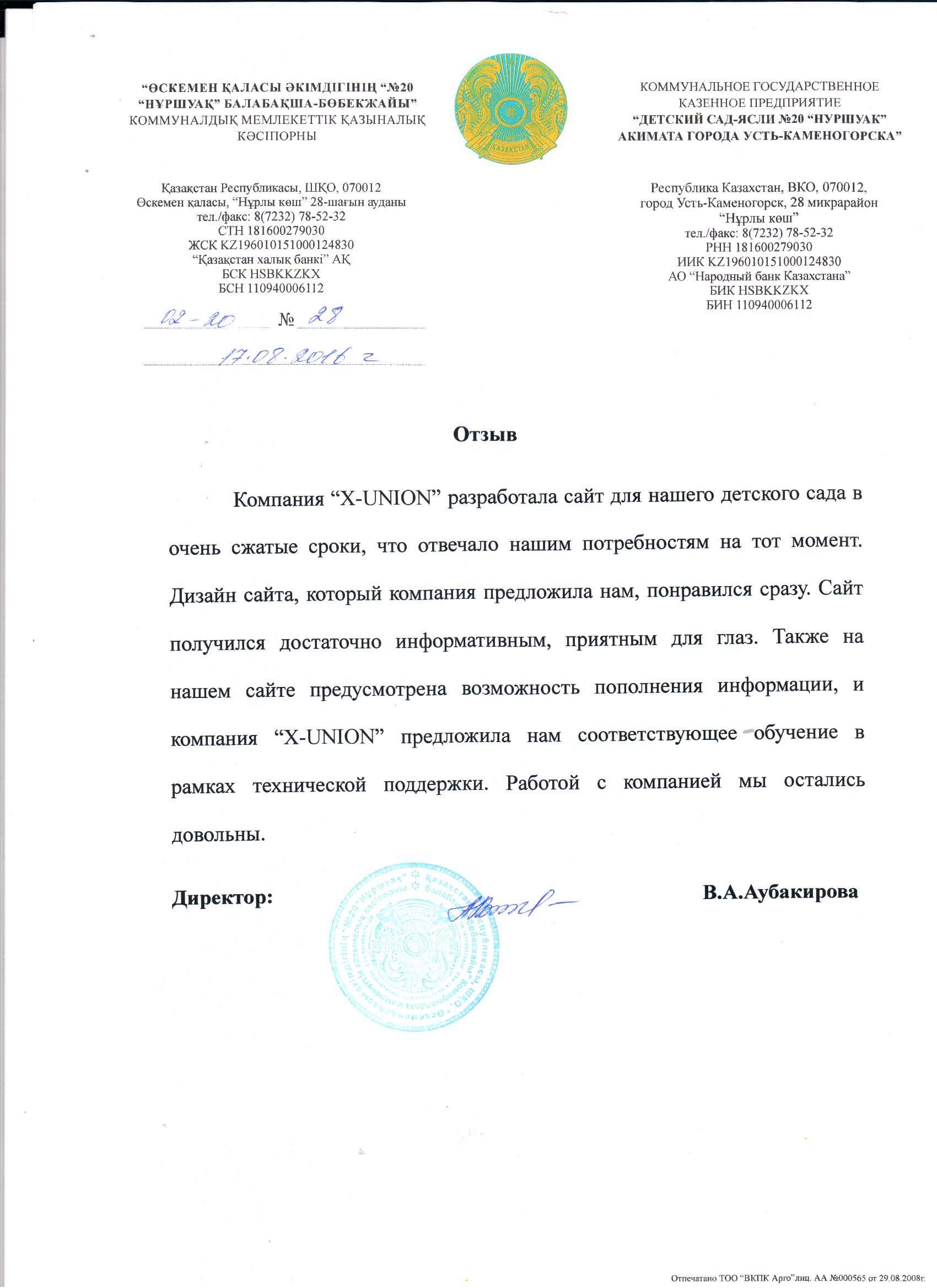 Учреждение КГУ "Детский сад №62 для детей с нарушениями речи" акимата города Усть-Каменогорска, в лице директора Ибраевой Гульден Ахметкалиевны выражает большую благодарность работе компании "X-UNION"!